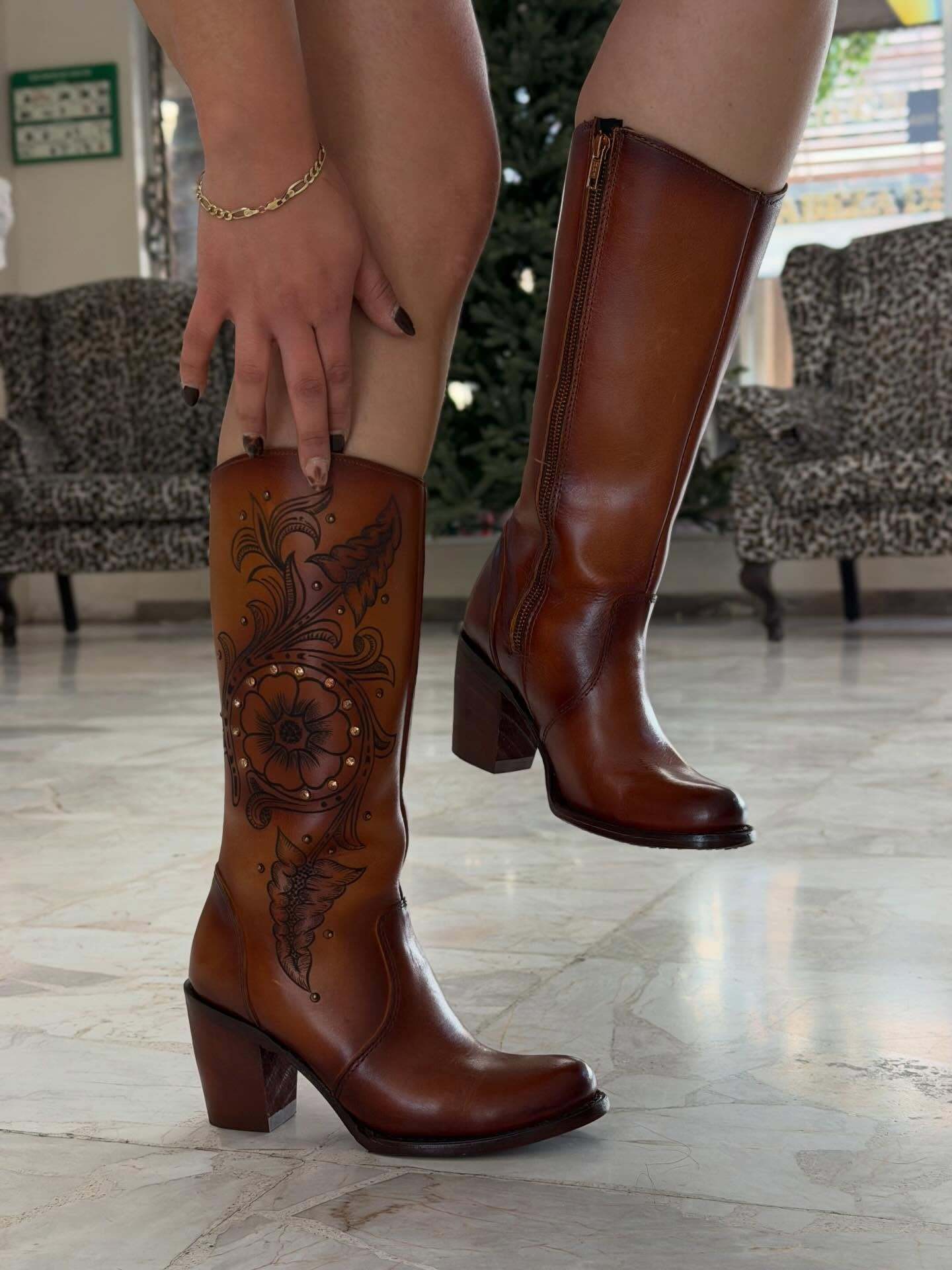 Hand-Carved Caramel Cowhide Boots